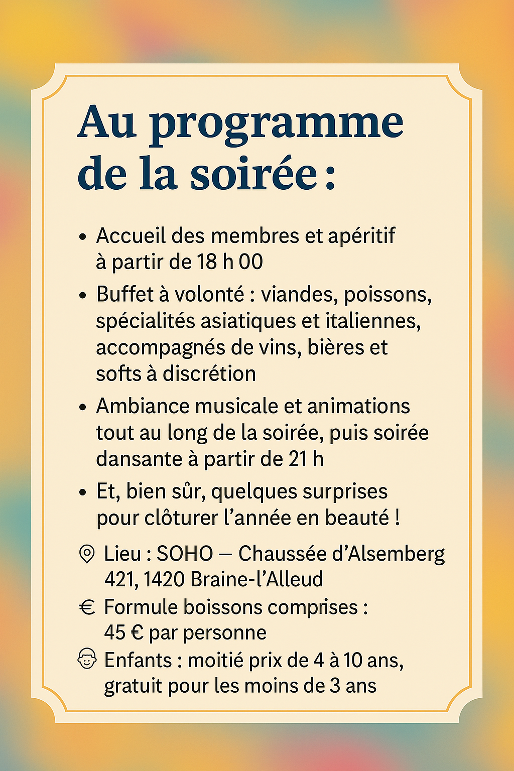 Venez nombreux partager ce dernier grand moment de l’année dans une atmosphère festive et élégante !